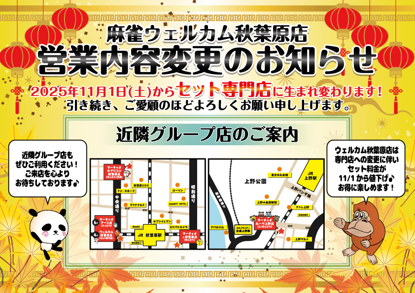 2025年11月1日(土)から、麻雀ウェルカム秋葉原店は「セット専門店」に生まれ変わることになりました!